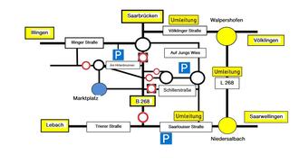 - Wegen der Vollsperrung des Teilbereiches der B268 ergibt sich für die Verkehrsteilnehmer aus Richtung Saarbrücken Richtung Lebach folgende Umleitungsempfehlung: