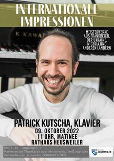 Der saarländische Pianist und Komponist Patrick Kutscha interpretiert Meisterwerke aus Frankreich, der Ukraine, Nigeria und anderen Ländern. Fester Bestandteil seines Programms sind ausgewählte Stücke eingängiger moderner Klavierliteratur, die in Deutschland sonst nur selten oder sogar nie aufgeführt werden. Außerdem erklingen wohlbekannte Werke von Claude Debussy, George Gershwin und Anderen."