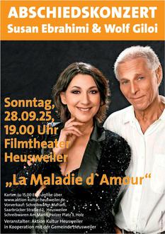 Die Aktion Kultur Heusweiler präsentiert am Sonntag, 28.09.25 um 19.00 Uhr im ehemaligen Filmtheater das Duo Susann Ebrahimi (Gesang) und Wolf Giloi (Klavier). Das Duo verabschiedet sich nach vielen Jahren mit ihrem musikalischen Programm „La Maladie d` Amour“ von seinem Publikum.