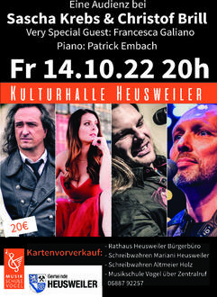 Christof Brill und Sascha Krebs sind zurück in Heusweiler.Dieses Mal mit dabei die sizilianische Allzweckwaffe Francesca Galiano.Bekannt aus dem Rhein Neckar Theater Mannheim, den Schlagertanten und aus den epochalen Duett-Abenden mit Sascha Krebs. Kongenial begleitet am Piano von Patrick Embach.Ein großer Abend führt die Zuschauer durch 70 Jahrzehnte Musik. Rock, Pop, Schlager, Musical - und Hebefigur - vielleicht.