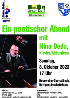 Die „Aktion Kultur Heusweiler“ und der Verein „Unser Dorf Obersalbach“ präsentieren am Sonntag, 08. Oktober 2023 um 17.00 Uhr im Dorfgemeinschaftshaus in Heusweiler-Obersalbach einen poetischen Abend mit Nino Deda (Klavier, Akkordeon):