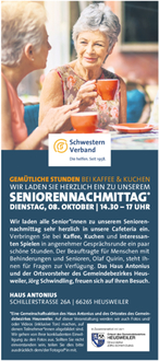 Dienstag 8. Oktober 14:30 Uhr, Haus Antonius, Schillerstraße 26A