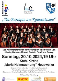 Die Aktion Kultur Heusweiler, die Gemeinde und die Pfarrei Oberes Köllertal Heilige Familie präsentieren am Sonntag, 20.10.2024 um 19.00 Uhr in der Katholischen Kirche „Maria Heimsuchung“ in Heusweiler das Kammerorchester der Großregion.
