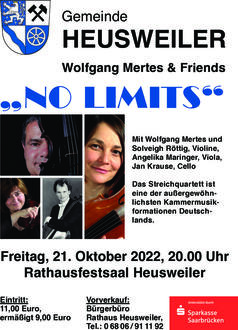 Das „No Limits“ Streichquartett ist eine der außergewöhnlichsten Kammermusikformationen Deutschlands. Mit Leichtigkeit wechseln die Musiker von Klassik zu Tango, vom Rhythmischen ins Elegische, von selbstarrangierten Cross over Werken zu betörenden Kleinoden der Quartettliteratur.