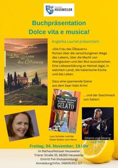 Die saarländische Autorin Angelika Lauriel stellt im Heusweiler Rathaus ihren druckfrischen Roman vor. In „Die Frau des Ölbauern“ erzählt sie eine bewegende und weitgespannte Familiengeschichte, die in traumhafter Kulisse spielt und in der es auch ums Essen und Genießen geht. Lauriel spricht fließend Italienisch und hat selbst ein Jahr in der Toskana gelebt. Durch ihren Vortrag lässt sie ihre Figuren in der Lesung lebendig werden.