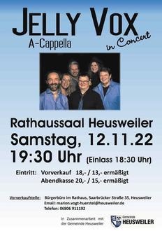 Seit 2012 schon erfüllen sich die sechs sangeserprobten Saarländer den Traum einer eigenen A-Cappella-Gruppe - und das trotz übervoller Terminkalender in anderen Formationen. So begeisterten Jelly Vox in letzter Zeit im Capitol Mannheim bei der "Langen Nacht der Stimmen, bei "Sing City 2018" in St. Wendel sowie beim SR-Konzert "Gunni Mahling & Friends". In jazzigen bis poppigen Arrangements verschmelzen die charakteristischen Stimmen von Sue Lehmann, Carmen Hofmann, Rainer Dochow-Meister, Jörg Zell, Bernd Bachmann zu einem samtigen Sound, der mit jedem Stück eine neue Stimmung zaubert und dem Tom Lehmann mit seiner kunstvollen Vocal-Percussion den nötigen Drive verleiht. Ehrliche, handgemachte Musik für Kopf und Herz, mit dem berührendsten und ursprünglichsten Instrument, das wir kennen - der menschlichen Stimme.