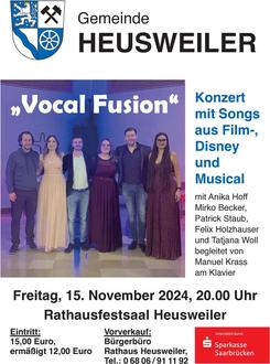 Das sechsköpfige Ensemble vocal fusion rund um Anika Hoff ist zurück und bringt am 15.11.24 ein buntes Programm aus Disney- & Musical und FilmSongs auf die Bühne des Heusweiler Rathauses.