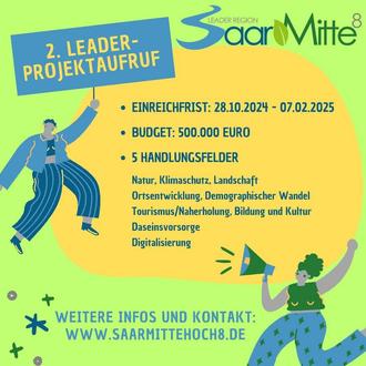 Die Lokale Aktionsgruppe (LAG) SaarMitte⁸ ruft vom 28. Oktober 2024 bis zum 07. Februar 2025 zum zweiten Projektaufruf auf, um innovative Projekte zur Umsetzung der lokalen Entwicklungsstrategie (LES) zu fördern. Für diesen Projektaufruf stehen insgesamt 500.000 Euro zur Verfügung. Gesucht werden Projekte, die sich einem oder mehreren der fünf Handlungsfelder zuordnen lassen: