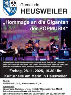 Andreas Nagels große Musikshow ist eine Hommage an die Giganten der Popmusik. Songs von Größen wie Tom Jones, Elvis Presley, den Drifters, Lou Rawls und vielen mehr lassen auf eindrucksvolle Weise die Herzen von Musikliebhabern höher schlagen.Es erwarten sie zwei Stunden voller Gefühl, Rhythmus und Leidenschaft. Andreas Nagel, eine groovige Begleitband und zwei charmante Sängerinnen entführen Sie musikalisch und optisch in die Clubs und Konzertsäle Großbritanniens und der USA.