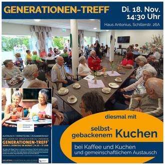 bei unserem nächsten Generationentreff am 18. November, Beginn um 14:30 Uhr, freuen wir uns auf Leckereien der hauseigenen Backstube. Die Mitarbeiterinnen und Mitarbeiter des Hauses Antonius werden uns mit selbstgebackenem Kuchen verköstigen.