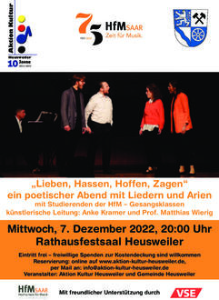 Die Aktion Kultur Heusweiler und die Gemeinde präsentieren am Mittwoch, dem 07. Dezember 2002 um 20.00 Uhr im Rathausfestsaal einen bunten poetischen Gesangsabend. Das Programm wird gestaltet von Studierenden der Gesangsklassen der Hochschule für Musik Saar (HfM Saar) unter der künstlerischen Leitung von Anke Kramer und Prof. Matthias Wierig.