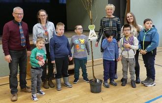 Es soll ein Symbol für die Kinder darstellen, die, wenn sie in der Schule schön lernen und mitarbeiten, auch später die Früchte ihrer Ausbildung ernten können. Alle Kinder der ersten Klasse, unterstützt auch von den älteren Schülerinnen und Schülern der Einrichtung, hatten ein Gedicht eingeübt, um den Bürgermeister zu empfangen.