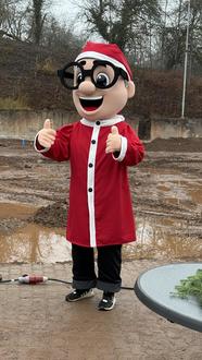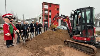 V.l.n.r: GWH-Maskottchen Paul Power, Christopher Karkosch (Bauleiter der Fa. Ehrhardt und Hellmann), Daniel Bürtel (Projektsteuerer), Christian Ehrhardt (Geschäftsführer Ehrhardt und Hellmann) Torsten Schramm (Geschäftsführer GWH), Karsten Nagel (Geschäftsführung der Stadtwerke Saarbrücken GmbH), Dr. Falk Ihrig (Geschäftsführer der Stadtwerke Saarbrücken Beteiligungsgesellschaft mbH.), Christian Wunn (Geschäftsführer GWH) und Thomas Redelberger (Bürgermeister Gemeinde Heusweiler) im Bagger.