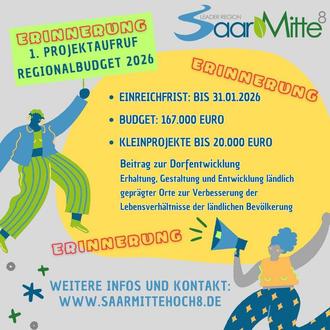 Nutzt die Chance, Eure Ideen für eine starke, kreative und lebenswerte LEADER-Region Saarmitte8 einzubringen. Für innovative Vorhaben stehen 167.000 € im Regionalbudget bereit – für Projekte, die unsere Region voranbringen, das Miteinander stärken und echte Impulse setzen.