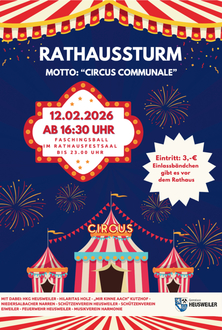 Auch in diesem Jahr findet die traditionelle Rathauserstürmung in Heusweiler am „Fetten Donnerstag“, den 12. Februar 2025 wieder statt. Um 16.30 Uhr wollen die Narren Bürgermeister Thomas Redelberger die Regentschaft streitig machen und mit lautstarkem „Alleh-Hopp“ ins Rathaus einziehen. Wenn ihnen dieses Vorhaben gelingt und sie in den Circus Kommunale einzutreten, steht mal wieder alles auf dem „Kopp“ und das „Faasend-Treiben“ wird, wie in den Jahren zuvor, im Festsaal des Rathauses ausgiebig gefeiert.