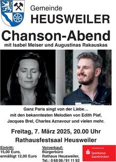 In der französischsprachigen Schweiz haben sich die saarländische Sängerin Isabel Meiser und der litauische Akkordeonist Augustinas Rakauskas kennengelernt. Im Saarland gaben Sie ihr Debut im Rahmen der Musikfestspiele Saar 2024 mit einem spektakulären Konzert in einem ICE von Saarbrücken nach Paris. Beide Musiker sind klassisch ausgebildet, bringen jedoch in diesem Konzert ihre Liebe zum französischen Chanson zum Ausdruck. Es erklingen einige der bekanntesten Melodien von Edith Piaf, Jacques Brel, Charles Aznavour und vielen mehr. Mal tänzerisch im französischen Musette-Stil, mal melancholisch und gefühlvoll gestalten Sie den Konzertabend und laden Sie ein auf eine Reise nach Paris mit Melodien wie „La vie en rose“, „Milord“, „La mer“ und „Sous le ciel de Paris“. Zwischendurch begeistert der preisgekrönte Akkordeonist Augustinas mit virtuosen solistischen Einlagen. Ein Muss für alle Chanson-Liebhaber …