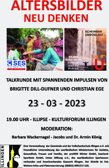 Gleich nach dem Auftakt in diesem Jahr, geht es am 23. März 2023 um 19.00 Uhr im Kulturforum Illipse weiter bei „Altersbilder: neu denken“, mit Brigtte Dill-Dufner, 70 - „Senior Experten Service“ und Christian Ege, 51 - „Generation Ü“. Beide aus dem Saarland und Menschen, die ihr eigenes Leben im Älterwerden spannend und ungewöhnlich gestalten, die uns viel zu einem wichtigen Thema erzählen können. Es laden ein und moderieren: Barbara Wackernagel-Jacobs und Dr. Armin König! Christian Ege, Ökonom und ehemaliger Staatssekretär gründete 2017 die „Generation Ü“ und bringt Menschen, die noch eine Betätigung im Ruhestand suchen mit interessierten Kunden zusammen, rechtlich zuverlässig und abgesichert. Eine Hilfe gegen den Fachkräftemangel, aber auch gegen das Pensionsloch, vor dem manche stehen bevor sie aufhören zu arbeiten. Brigitte Dill-Dufner, freie Journalistin, arbeitet nicht nur bei Generation Ü mit, sondern ist auch die Repräsentantin des „Senior Experten Service (SES)“ im Saarland. Der SES, eine Stiftung der Deutschen Wirtschaft, vermittelt Projekteinsätze für Experten und Expertinnen in Entwicklungs- und Schwellenländer, auch und gerade Menschen im Ruhestand. Sie selbst war schon im Einsatz in Mazedonien.