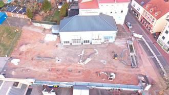 Die nächsten Schritte umfassen den Bau der Entwässerungsrinnen sowie die Verlegung des Natursteinpflasters und der Asphaltfläche. Damit wird das Gelände harmonisch an den bestehenden Bereich des neuen Marktes angebunden.