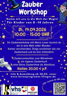 Ein Tag voller Wunder, Staunen und verblüffender Tricks erwartet die Kinder: Karten verschwinden, Dinge erscheinen wie von Zauberhand – und du bist mittendrin! Unter der Anleitung eines erfahrenen Zauberers lernst du spielerisch einfache Zaubertricks mit Zauberutensilien und Alltagsgegenständen, die du schon bald selbst vorführen kannst – ob zuhause, in der Schule oder bei Freunden.