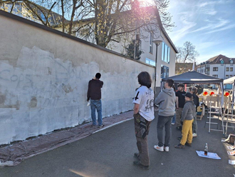 Eine Woche danach startete dann die Umsetzungsphase des Projektes: an vier Tagen jeweils von 13:00 – 18:00 Uhr wurde fleißig an der Wand gearbeitet. Doch bevor gesprüht werden konnte, musste erst mal alles abgeklebt werden. Laternenpfähle und Hydrantenschilder sollen natürlich farblos bleiben. Die Wand wurde mit Bürsten grob gesäubert und danach mit Tiefengrund grundiert. Mit weißer Farbe wurden alte Graffitis übermalt um eine möglichst weiße Oberfläche zu erhalten. Eine perfekte Ausgangslage für das neue Jugend- Kunstwerk. Danach gab es mit Edem Dippel, dem Graffitikünstler eine kurze Einführung: wie halte ich die Dose am Besten? Was sind die Do's und Dont's beim Sprühen?! Danach kam dann endlich die erste Farbe an die Wand. Als ersten Step wurde die Leinwand in vier gleich große Teile geteilt. Denn wie beim Vortreffen entwickelt, sollten ja die vier Jahreszeiten künstlerisch dargestellt werden. Danach kamen dann die ersten groben Entwürfe an die Wand. Der zweite Tag im Projekt begann mit Dosen schütteln: denn nur so kommt auch Farbe an die Wand! Gesagt, getan. Alle Teilnehmenden haben kräftig abgeschüttelt und dann fleißig ihre Kunstwerke an der Wand skizziert. Unerlässliche Helfer dabei? Leitern und natürlich unser mobiles Gerüst. Dank Silas und Tobi konnten alle Teilnehmenden sicher in der Höhe arbeiten. Danke für euren unermüdlichen Einsatz! Zwischendurch gab Graffitikünstler Edem Dippel natürlich Tips und Ratschläge. Am Ende des zweiten Tages waren alle Hauptmotive bereits zu erahnen. Im Bereich Frühling sind neben einem Schmetterling und bunten Blumen auch Aliens mit einem Raumschiff zu sehen, im Sommer sind ein Ententeich und der Schriftzug Yolo zu erkennen, während im Herbst neben der Burg Kerpen mit stattlichem Ritter auch ein Baum in herrlichen Farben umgesetzt wurde. Im Winter ist ein Schneemann und winterlicher Baum zu erkennen. Dabei haben die Künstlerinnen bei jeder Jahreszeit ein eigenes Farbschema verwendet.