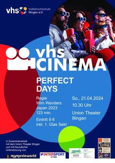 „VHS CINEMA“ ist eine Veranstaltungsreihe, in der die VHS Illingen in Zusammenarbeit mit der VHS Lebach, dem Union Theater Illingen, mit freundlicher Unterstützung von InterSport STIWI, Zewe Meß- und Trocknungstechnik GmbH sowie Schmuckgestaltung Kerstin Schuppener, Einblicke in besonders interessante Dokumentar- oder Spielfilme geben möchte. Am Sonntag, den 21. April 2024, 10:30 Uhr, Union Theater Illingen spielen wir „PERFECT DAYS“, Regie: Wim Wenders, Japan 2023, 123 min.. Der Toilettenreiniger Hirayama führt ein einfaches und zufriedenes Leben, in dem Musik, Fotos und Bücher eine große Rolle spielen, aber auch die Liebe zu seiner Arbeit. Der mit „furioser Leichtigkeit“ erzählte Film behandelt „liebevoll“ die „Macht, Monotonie, den Trost und die Ruhe“ der immer gleichen Dinge im Leben dieses stillen und zärtlichen Außenseiters. Dieser „traumschöne“ und poetische Film erhielt zwei Preise beim Filmfestival in Cannes, darunter den Preis für den besten Schauspieler für Koji Yakusho sowie eine Oscar-Nominierung als bester internationaler Film. Wir freuen uns, wenn die Fangemeinde wächst! Der Eintritt kostet 8 € inklusive einem Glas Sekt. Mehr dazu auch unter www.my-movie-world.de. Kartenreservierung: 06825 1411.