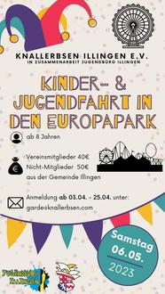 Die Knallerbsen Illingen e.V. veranstalten gemeinsam mit dem Jugendbüro Illingen am Samstag den 06.05.2023 eine Tagesfahrt in den Europapark Rust. Der Europapark macht das Unmögliche möglich. Hier kannst du an nur einem Tag durch 16 europäische Länder reisen und dabei spannende Fahrgeschäfte, Achterbahnen und detailverliebte Themenbereiche entdecken. Mitfahren dürfen alle Kinder und Jugendliche zwischen 8-18 Jahren der Gemeinde Illingen. Die Kosten betragen 40,00 € für Mitglieder des Karnevalvereins Knallerbsen e.V. Alle anderen zahlen 50,00 € für die Tagesfahrt. Im Preis enthalten sind: der Transfer im modernen Reisebus, Eintrittsgeld in den Europapark und die Betreuung durch geschultes Personal.