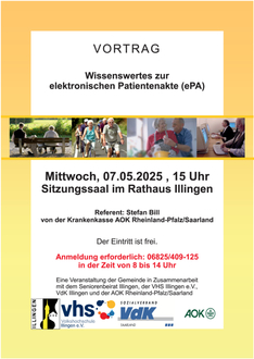 Zu einem Vortrag zum Thema „Wissenswertes zur elektronischen Patientenakte (ePA)“ lädt die Gemeinde Illingen, Fachbereich Bürgergemeinde und Demografie für Mittwoch, in den Sitzungssaal im Rathaus Illingen, Hauptstr. 86, ein.