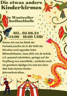 Die Kinderkirmes wird am 02.06.2024 von 14:00 Uhr – 18:00 Uhr an der Seelbachhalle in Wustweiler stattfinden.
