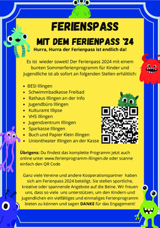 Hurra, hurra der Ferienpass 2024 ist da! Viele unterschiedliche Angebote für Kinder und Jugendliche ab7 Jahren in den Sommer- und Herbstferien werden geboten. Der Ferienpass wird in allen Grundschulen der Gemeinde Illingen, der Gemeinschaftsschule und dem Illtal Gymnasium Illingen an die Zielgruppe verteilt. Zusätzlich ist die kleine Broschüre ab Mo., 21.05.2024 an den aufgeführten Auslagestellen kostenlos erhältlich. Das komplette Ferienprogramm ist ab sofort ebenfalls online zu finden unter www.ferienprogramm-illingen.de oder ihr scannt den abgebildeten QR Code.