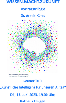 Am Dienstag, den 13. Juni 2023, 19:00 Uhr laden wir zum abschließenden Teil dieser Trilogie zu dem topaktuellen Thema: „Künstliche Intelligenz für unseren Alltag“, live und ohne Filter, in den historischen Sitzungssaal des Rathauses Illingen ein! Nein, wir müssen uns nicht fürchten vor Künstlicher Intelligenz (KI). Sie hat längst schon Einzug in viele Alltagsbereiche gehalten. Durch ChatGPT ist KI zu einem Megathema geworden. ChatGPT verändert die Welt. Es ist ein textbasiertes Dialogsystem. Angeblich kann es Referate schreiben, Prüfungsaufgaben erledigen - reden und schreiben wie ein Profi – aber auch viel Unsinn von sich geben. Armin König hat es getestet und arbeitet regelmäßig damit. An seinen Versuch-und-Irrtum-Erfahrungen lässt er uns teilhaben und er stellt wichtige Fragen zur Ethik der Nutzung Künstlicher Intelligenz. Auch juristisch ist die Angelegenheit nicht ganz trivial.