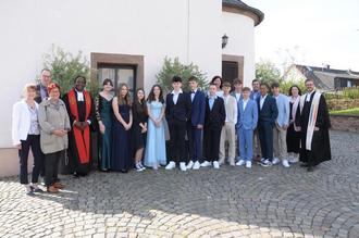 Konfis von links: Ava Biehler, Luisa Menges, Jana Leidinger, Hannah Pirrung, Johanna Baierschmitt, Corvin Schaaf, Lennard Bonner, Johannes Bauer, Bero Schuppener, Liam Michel, Nico Dörr