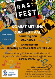 Kommt mit uns und dem Landkreis Neunkirchen, am 20.07.2024 mit nach Karlsruhe und gemeinsam besuchen wir „Das Fest“, eines der größten und beliebtesten Festival Deutschlands.