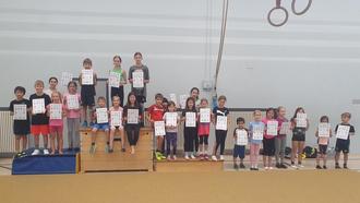 Erstmalig mit dabei war im diesjährigen Ferienpass der Turnverein 1900 e.V. Hüttigweiler. Erstaunlich gut wurde ihr Angebot angenommen. Ganze 29 Kids haben teilgenommen und einen vielfältigen Tag in der Welt des Turnens erlebt. Zunächst konnten sich die Kinder an den verschiedenen Turngeräten ausprobieren. Da ging es direkt richtig zur Sache. Beim Bodenturnen wurden Rollen vorwärts und rückwärts geturnt, das Gleichgewicht und die Körperspannung beim Handstand geübt und Räder geschlagen. An weiteren verschiedenen Stationen zum Balancieren und Hangeln konnten sich die Kinder weiter austoben. Auch andere Geräte wie Reck, Parallelbalken, Ringe, Trampolin und Bockspringen wurden ausprobiert. Ganz schön vielfältig der Turnsport! Als Stärkung gab es zur Mittagszeit leckere Rostwürstchen. Nach der Pause konnten die Kinder das echte Feeling eines Turnwettkampfs miterleben. Bei der Turnolympiade wurden die Teilnehmer*innen in vier Mannschaften eingeteilt und traten in Teams gegeneinander an. Satte sieben Disziplinen wurden absolviert. Ihr Können konnten die Turner*innen beispielsweise im Hindernisparcours oder beim Rollenschlagen zeigen. Wie viele Rollen vorwärts schafft man eigentlich in einer Minute? Oder wie weit kann man aus dem Stand springen? Da wurde ganz schön was geboten! Am Ende gab es sogar eine Siegerehrung mit Urkundenverleihung und viele strahlende Kindergesichter.