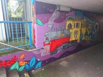 Gennweiler, Juli 2025 – Was bisher eine triste Bahnunterführung war, ist nun ein echter Blickfang: Im Rahmen des Ferienpassprojekts „Jugendkunst braucht Raum“ wurde der Tunnel in Gennweiler von Jugendlichen aus der Gemeinde Illingen in ein fantasievolles Gesamtkunstwerk verwandelt – kreativ begleitet vom Künstler Edem Dippel und organisiert vom Jugendbüro Illingen. Eine Woche lang wurde gesprayt, skizziert, gefeiert und – ganz nebenbei – ein grauer Durchgang in ein buntes Wunderland verwandelt. Inspiriert vom Motto „Folge dem weißen Kaninchen“, angelehnt an Alice im Wunderland, gestalteten die Jugendlichen gemeinsam einen überdimensionalen Graffiti-Zug, der sich nun farbenprächtig durch die Tunnelwände schlängelt.Jeder Wagon erzählt eine eigene Geschichte: Vom Superheldenabteil über Fußballfieber bis hin zu fantastischen Burgen und surrealen Uhrwelten – die Motive sind ebenso vielfältig wie die jungen Künstlerinnen und Künstler selbst. Und obwohl jeder Wagon individuell gestaltet wurde, ergibt sich am Ende ein stimmiges Gesamtbild: ein fantasievoller Zug durch eine Welt der Träume, Farben und Ideen.Bevor jedoch die ersten Farbnebel durch den Tunnel zogen, hieß es erst mal: Fläche reinigen, Tunnel abkleben, Sprühdosen sortieren – echte Vorarbeit also, bevor die Kunst Einzug halten konnte. Doch der Aufwand hat sich gelohnt: Mit jeder Spraydose wurde der Tunnel lebendiger, lauter, bunter. Und das nicht nur optisch, sondern auch im Denken.