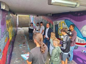 Bürgermeister Andreas Hübgen ließ es sich nicht nehmen, persönlich vorbeizuschauen – wie bereits bei früheren Graffiti-Projekten. Er zeigte sich beeindruckt vom Engagement der Jugendlichen: