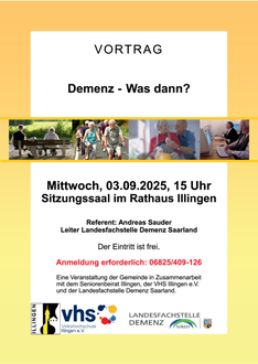 Diese Veranstaltung ist eine Kooperation zwischen der Gemeinde Illingen, der VHS Illingen e.V., des Seniorenbeirates und der Landesfachstelle Demenz Saarland.