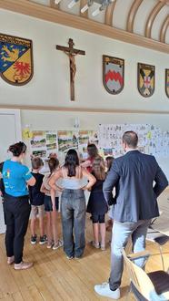 Freitags hatten Bürgermeister Andreas Hübgen, das Jugendbüro und die Kinderbeauftragte Lisa Hoffmann-Kuhnen dann Besuch im Rathaus Illingen! Die Kinder aus der Kreativwerkstatt waren im Rathaussaal zu Gast. Es fand der nächste wichtige Meilenstein bei der Beteiligung zur Gestaltung des neuen Spielplatzes im Burgpark statt: die Kinder hatten zuvor ihre Ideen und Visionen zum Thema "Ritter an der Ill“ in einem kreativen Prozess in selbstgebastelten Modellen festgehalten (Wir berichteten). Damit auch die Politik weiß, was sich die Kinder so vorstellen begann die Veranstaltung mit der Präsentation der gebauten Modelle. Bürgermeister Hübgen begrüßte die Besucher*innen herzlich und zeigte sich begeistert von der Vielfalt und der Originalität der vorgestellten Konzepte. „Es ist beeindruckend zu sehen, wie viel Mühe/ Herzblut in diese Modelle geflossen sind. Die Beteiligung der Kinder für andere Kinder ist ein wertvoller Beitrag zur Entwicklung eines Spielplatzes, der von allen geliebt und genutzt wird“, lobte der Bürgermeister. Nach der Vorstellung der Modelle folgte die Präsentation der verschiedenen Planentwürfe, die auf den gesammelten Ideen der Kinder und den Ergebnissen aus den Fragebögen basierten. 4 verschiedene Entwürfe gab es zu bestaunen. Dorothee Schmidt vom Bauamt erklärte die Pläne erst aus der Vogelperspektive und dann detailliert jedes Spielgerät mit seinen Funktionen. PUH! Ganz schön viele Informationen. Danach erhielten die Kinder bunte Klebepunkte mit denen sie ihre Favoriten markieren. Um bei so viel Input nicht den Überblick zu verlieren, erarbeiteten die Kinder ganz fleißig und konzentriert mit Hilfe von Hit Raketen und Motz Monstern was sie an den jeweiligen Plänen gut und nicht so gut finden. Viel zu motzen gab es nicht, kritische Stimmen wurden bspw. zu einer möglicherweise zu geringen Anzahl an Schattenplätzen oder langweiligen Spielgeräten laut. Mit diesem Überblickt über die Pro's und Contra's erarbeiteten wir im Anschluss so detailliert wie möglich Schritt für Schritt gemeinsame Ergebnisse. Dazu wurde mit farbige Karten demokratisch abgestimmt und gemeinsam diskutiert. Wie sollen die Spielgeräte aussehen, welche Funktionen sind wichtig, haben wir auch an die Kleineren gedacht, was ist mit Kindern die ein Handycap haben? All das und vieles mehr haben wir dabei berücksichtigt. Gar nicht so einfach! Bei fachlichen Fragen konnten die Teilnehmenden auf Dorothee Schmidts Expertise zurückgreifen. Am Ende waren alle Teilnehmenden ganz schön geschafft. Wir sind unheimlich stolz auf eure Leistung und euer Durchhaltevermögen in Sachen Spielplatzplanung! Diese enthält sogar ein Projekt, bei dem die Kinder selbst mitanpacken können. Die momentane steinerne Schlange (Begrenzung vom Sandkasten) soll mit Pinsel und Farben in einen Drachen verwandelt werden. Mit den tollen Ergebnissen wird nun ein finaler Plan des Spielplatzes erarbeitet, die Kosten genauer kalkuliert und Förderungen beantragt. Der finale Plan wird den Kindern an einem Folgetermin voraussichtlich im Herbst dann noch einmal vorgestellt. Auch der Ortsrat Illingen wird über die Ergebnisse und die einzelnen Schritte der Beteiligung in einer Sitzung durch die Jugendpflege informiert. Bis zum nächsten Schritt werden die Modelle der Kinder in Illingen ausgestellt werden. Gerade sind wir dazu noch auf der Suche nach einer passenden Räumlichkeit. (Über Hinweise freuen wir uns über Hinweise). Wir bedanken uns bei den Illinger Kindern für eure Begeisterung und das Engagement im Projekt, den Eltern für ihr Vertrauen, dem Bauamt Illingen für die Begleitung des Prozesses, der Kinderbeauftragten für ihren Einsatz, dem Bürgermeister für die Offenheit und allen helfenden Händen ohne die solche partizipativen Projekte nicht möglich wären und freuen uns auf die nächste Phase.