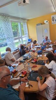 Am Samstag fand im Rahmen des Ferienpasses der Gemeinde das spannende Angebot „Elektronikbasteln“ mit dem Deutschen Amateur-Radioclub-Ortsverband-Illingen (DARC) im Clubheim in Welschbach statt. Unter der fachkundigen Anleitung der Funkamateure hatten die teilnehmenden Kinder und Jugendlichen die Gelegenheit, erste Erfahrungen im Bereich Elektronik zu sammeln und gleichzeitig kreative Projekte umzusetzen. Insgesamt wurden drei verschiedene Platinen-Bausätze angeboten, die am Ende jeweils ein kleines, aber beeindruckendes Projekt ergaben. Die jungen Tüftler konnten ein flackerndes Lagerfeuer, ein strahlendes Atom und einen elektronischen Würfel, der die gewürfelte Zahl mit LEDs anzeigt, selbst herstellen. Je nach Anleitung wurden die Bauteile seitenrichtig in die dafür vorgesehenen Leiterplatten gesteckt und auf der Rückseite sorgfältig verlötet. Hier noch ein Schalter eingebaut und dann ab an die Batterie zum Testen. Ganz schön spannend dieser Moment! Werden alle LED’s leuchten? Dank der gut vorbereiteten Bausätze und der Unterstützung der DARC-Mitglieder waren alle Projekte erfolgreich und die Ergebnisse konnten sich sehen lassen. „Es ist großartig zu sehen, mit welcher Begeisterung die Kinder und Jugendlichen an die Sache herangehen“, sagte Detlef Lenkawa. „Wir möchten ihnen zeigen, dass Elektronik nicht nur kompliziert ist, sondern auch viel Spaß machen kann.“ Der Amateur-Radio Club macht aber nicht nur solche Projekte, er knüpft Kontakte rund um die Welt, betreibt Amateurfunkfernsehen und auch eine UKW-Relaisstelle in exponierter Lage im Marpinger Ortsteil Rheinstrasse. Sogar mit der ISS im Weltraum haben sie schon einmal Funkkontakt gehabt. Ganz schön beeindruckend! Der Tag war nicht nur technisch, sondern auch kulinarisch ein Highlight. Als kleine Stärkung wurde ein besonderes Schmankerl von der örtlichen Bäckerei Ruloff serviert: Ein leckerer Hefezopf mit süßer Garnitur, der aussah wie ein kleines Krokodil. Das fand bei den jungen Teilnehmern großen Anklang. Die Veranstaltung endete mit stolzen Gesichtern und leuchtenden Projekten, die die Kinder mit nach Hause nehmen durften. Der DARC OV Illingen bedankt sich bei allen Teilnehmern und Helfern für einen gelungenen Tag voller Technik und Spaß. Der nächste Ferienpass ist bereits in Planung, und es wird sicher wieder ein aufregendes Angebot geben. Ihr habt Interesse daran, was der deutsche Amateur-Radio-Club sonst noch so macht?