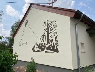 Foto: Drachen steigenlassende Kinder. Rekonstruktion des Sgrafittos von Walter Bernstein am Haus der Vereine in Wustweiler.