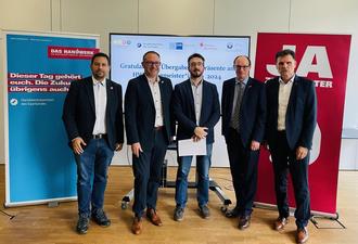 Als Zeichen der Wertschätzung überreichte Landrat Sören Meng mit WFG-Geschäftsführer Klaus Häusler, HWK Saarland Präsident Helmut Zimmer, dem HWK Saarland Hauptgeschäftsführer Jens Schmitt und den kommunalen Bürgermeistern*in oder Beigeordneten neben einer Urkunde, auch einen veredelten Schreiber mit dem Namen der IHK-Absolventen*innen und Jungmeister*in.
