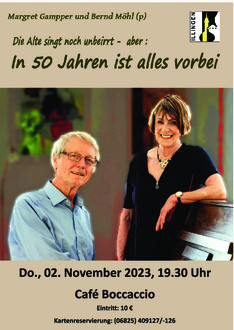 Am Donnerstag, den 02. November 2023, um 19.30 Uhr laden das Duo Gampper/Möhl und Gabi Stullgys zu einem ganz besonderen musikalischen Abend nach Uchtelfangen ins Café Boccaccio, Josefstraße 26, ein! Margret Gampper und Bernd Möhl präsentieren einen kurzweiligen Streifzug durch die Liedkultur der Kleinkunst vergangener Jahrzehnte. Die Lieder von beispielsweise Otto Reuter und Friedrich Holländer, aber auch Chansons von Hildegard Knef, besonders auch die von Marlene Dietrich gesungenen Lieder haben bis heute an Aktualität nichts eingebüßt. Die niveau- und humorvollen Beiträge und die satirischen Textüberleitungen garantieren einen unterhaltsamen Abend. In altbewährter Weise erfreut das Duo Gampper/Möhl das Publikum mit Gesang-, Schau- und Tastenspiel in einem Kleinformat-Festival. Eintritt: 10 € an der Abendkasse. Kartenreservierung: 06825 409127/-126.