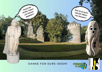 Unsere Geschichte begann schon vor einiger Zeit: im Rahmen der Neugestaltung des Spielplatzes im Burgpark hat die Gemeinde Illingen und die Kinderbeauftragte vor allem euch Kinder befragt! In einem Beteiligungsprojekt durftet ihr mitreden, eure Wünsche und Ideen einbringen und sogar richtig tolle Modelle bauen. Dort waren auch ein großes Burggespenst und ein rostiger Ritter zu finden. So kam die Idee auf, dass wir als coole Holzfiguren den Park richtig lebendig machen.