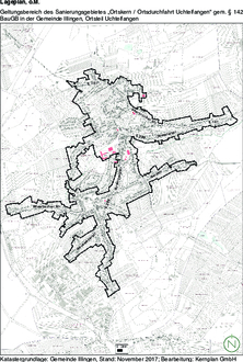 (1) Der räumliche Geltungsbereich des Sanierungsgebietes umfasst alle Grundstücke und Grundstücksteile innerhalb der im anliegenden Lageplan (Gemeinde Illingen; Stand: November 2017) durch eine Umgrenzungslinie abgegrenzten Fläche. Der Lageplan ist Bestandteil der Satzung und wird zu jedermanns Einsicht bei der Gemeinde Illingen, Rathaus, während den allgemeinen Dienststunden bereitgehalten.