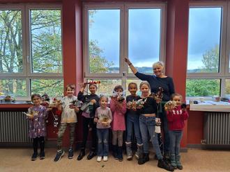 Die Blätter färben sich langsam bunt – das heißt: der Herbst ist wieder da! Passend dazu fand am Donnerstag ein Kreativworkshop im Ferienprogramm der Gemeinde Illingen statt. Gemeinsam mit Annelie haben wir uns thematisch in die Welt der Waldtiere begeben: was sehen wir denn da? Eine Eule mit bunten Fliegenpilzen! Aus allerlei Naturmaterialien gestalteten die Teilnehmerinnen ihre ganz eigene herbstliche Dekoration zum mit nach Hause nehmen. Tolle Kunstwerke sind dabei entstanden! Im Herbst steht ja auch noch die Gruselnacht des Jahres an: Halloween. Passend dazu konnten die Bastlerinnen im Workshop zusätzlich schaurig schöne Deko gestalten: kleine Mumien, Frankensteins Monster oder doch ein Vampir? Dabei setzte Annelie bei den Materialien auf Upcycling: Klopapierrollen, Eierkartons, alte Dosen und Verpackungen wurden von den Teilnehmenden in Kunstwerke verwandelt. Mit den phantasievollen Dekorationen sind die kleinen Künstlerinnen perfekt ausgestattet für die etwas dunklere Zeit und können ihr zu Hause mit Selbstgebasteltem gemütlich dekorieren. Wir sagen danke für einen kreativen Vormittag!
