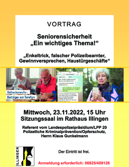 Zu einem Vortrag zum Thema „Seniorensicherheit – ein wichtiges Thema“ lädt die Gemeinde Illingen, Fachbereich Bürgergemeinde und Demografie, für