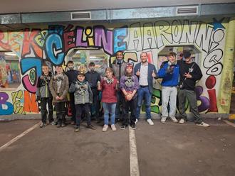 Tag für Tag und Stunde für Stunde wurden die Kunstwerke in der Tiefgarage fertiggestellt. Mit vereinten Kräften wurden fast alle weißen Flächen der unteren Ebene mit Ideen gestaltet und das Ergebnis kann sich echt sehen lassen! Entstanden ist ein echtes Unikat in Illingen – ein kunterbuntes Jugendkunstwerk auf zwei Ebenen, in dem man sich gar nicht so richtig satt sehen kann. Davon wollte sich auch Bürgermeister Andreas Hübgen persönlich überzeugen und besuchte die Jugendlichen am letzten Tag des Projektes in der Tiefgarage. Hier kam er mit dem kleinen und großen Künstler*innen ins Gespräch und nahm sich Zeit. Er bedankte sich bei den Teilnehmenden für ihr Engagement in der Projektwoche und ihren Einsatz mit einem süßen Präsent. Er sei überwältigt vom Ergebnis. Graffiti sei in vielen Köpfen negativ behaftet und würde oft als Schmiererei wahrgenommen. Durch das Projekt haben die Jugendlichen die Chance genutzt zu zeigen, dass Graffiti mehr sein kann als nur das! Zur Sprache kam bei der Gelegenheit auch ein Anliegen der Illinger Jugendlichen: eine legale Wand/ Fläche welche sie auch unabhängig von Projekten mit dem Jugendbüro mit ihrer Graffitikunst in Illingen gestalten dürfen. Herr Hübgen war offen für diese Idee. Gemeinsam mit dem Jugendbüro der Gemeinde wird nun eine geeignete Fläche zur Umsetzung dieses Herzenswunsches gesucht. Wer Ideen oder Vorschläge hat, kann diese gerne beim Jugendbüro der Gemeine unter Tel.: 06825 409 124 oder unter tamara.gotzmann@illingen.de kundtun.