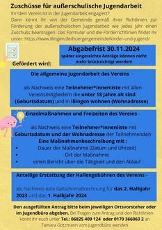 Ihr / Dein Verein ist in der Jugendarbeit engagiert? Dann könnt ihr von der Gemeinde gemäß ihrer Richtlinien zur Förderung der außerschulischen Jugendarbeit - wie jedes Jahr- einen Zuschuss für euren Verein beantragen.