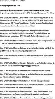 Das EVS Kunden-Service-Center ist am Fetten Donnerstag (8. Februar) nur telefonisch von 8:00 bis 16:30 Uhr (Tel. 0681 5000-555) erreichbar und am Rosenmontag (12. Februar) geschlossen. An allen anderen Faschingstagen ist das Kunden-Service-Center normal erreichbar.