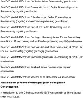 Das EVS Wertstoff-Zentrum Illingen ist am Fetten Donnerstag geschlossen. An Rosenmontag ist regulärer Schließtag.