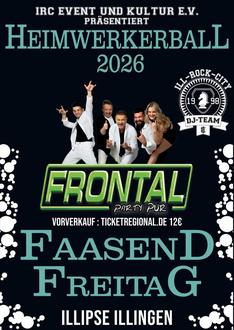 Am Freitag, den 13. Februar 2026 heißt es „Herzlich Willkommen“ zum Heimwerkerball des neu gegründeten „IRC-Event und Kultur e. V. “. An diesem Abend wird die deutschlandweit bekannte Partyband „Frontal“ für eine krachende Stimmung in der Illipse in Illingen sorgen. In den Pausen wird das IRC-DJ-Team die Menge anheizen. Zudem wird es Köstlichkeiten von „Exzellentes-Gastro“ geben und leckere Getränke durch den Verein. Wir freuen uns darauf, den Karneval in Illingen aufleben zu lassen.
